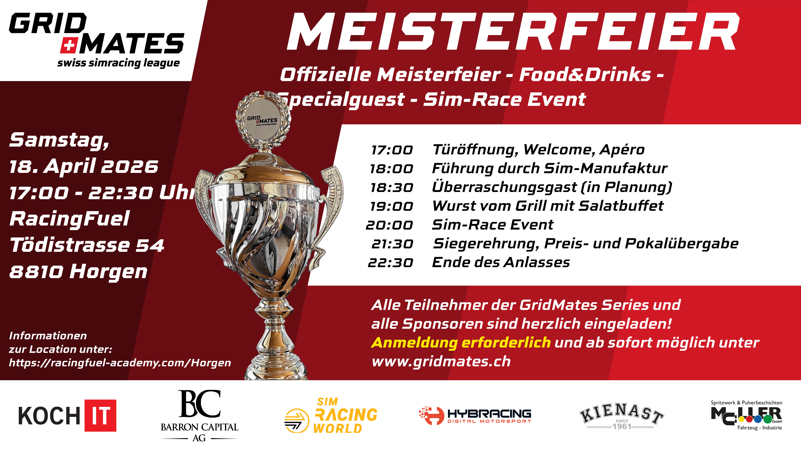 Am Samstag, 18. April 2026 feiern wir gemeinsam den Saisonabschluss der GridMates Series bei RacingFuel in Horgen. Euch erwartet ein entspannter Abend mit Welcome-Apéro, Führung durch die Sim-Manufaktur, Special Guest (in Planung), Food & Drinks, Sim-Race Event sowie der offiziellen Siegerehrung mit Pokalübergabe.
